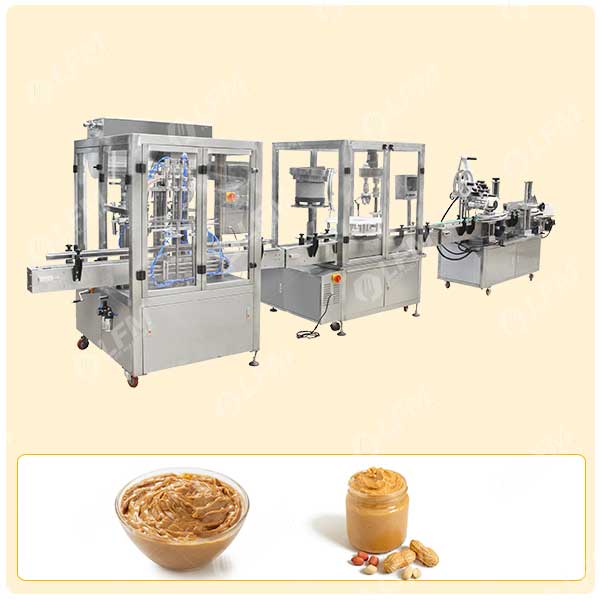 خط تعبئة زبدة الفول السوداني الأوتوماتيكي بالكامل: التعبئة الأوتوماتيكية – تغطية الزجاجة الأوتوماتيكية – وضع العلامات الأوتوماتيكية. آلة تعبئة وتغطية الزجاجات الأوتوماتيكية بالكامل مناسبة لملء زبدة الفول السوداني والكاتشب والمربى والكريمة وغيرها من المنتجات شبه السائلة والمعجونة واللزجة والصلصة.
