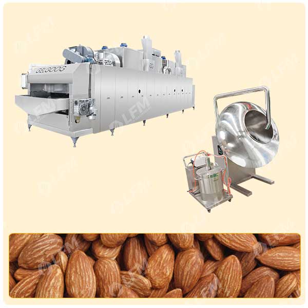 مرحلة نكهة الكراميل: تبدأ الماكينة بنظام رش أوتوماتيكي لمعجون الكراميل المقاس بدقة، والذي يقوم بتوزيع الكراميل بالتساوي على سطح اللوز ويضمن، من خلال التحكم الدقيق في درجة الحرارة، التصاق الكراميل في وقت قصير ويحقق النكهة المرغوبة. تأثير تحلية، مما يعطي اللوز رائحة الكراميل الغنية.